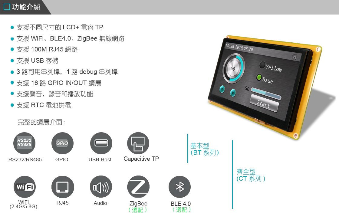 功能簡介: DMA-HMI RTOS BASE 智能終端,以自行開發功能強大且簡單好用系統為主軸,除了IO等其他介面之外,並整合有線、無線等通訊方面的介面,可以讓客戶的產品應用上得心應手(going smoothly and easily)。因此主板功能強大,客戶可依自己的需求功能選擇不同的系列,分為基本型(BT系列),齊全型(CT系列)。 DMA-HMI RTOS BASE 智能終端一體成型,結合了各種不同尺寸的LCD+電容TP驅動板(4.3、5.0、7.0、10.1吋)與主板連接共用,在功能設計及顯示上做更有彈性的配合,因其具有整合LCD及電容顯示的特性,一般不需要很強大ARM ANDROID或LINUX為主軸的系統,是另一種較低成本方案的選擇。