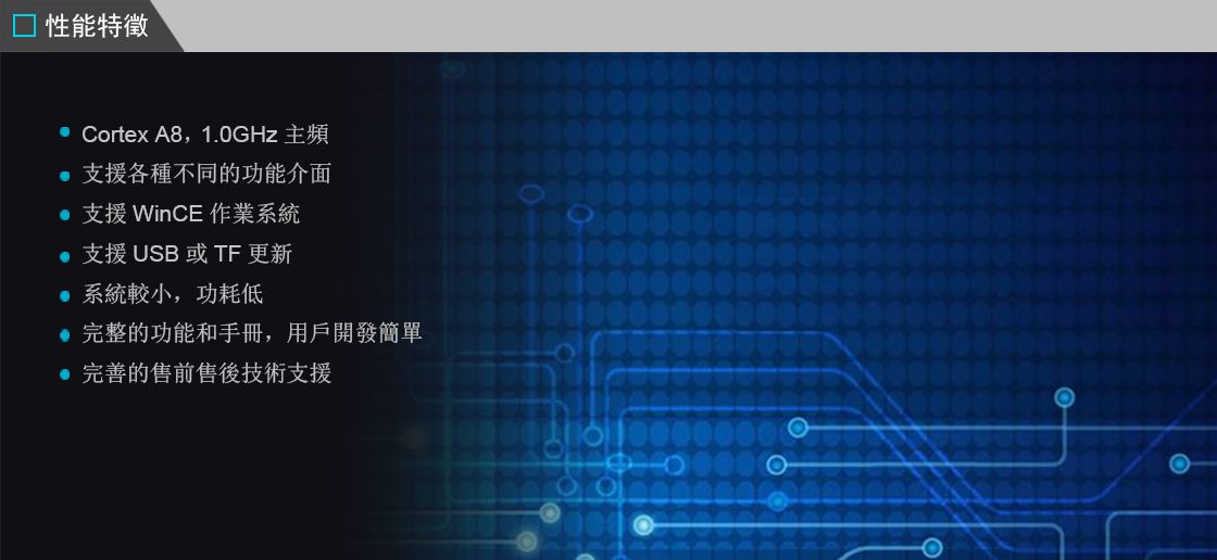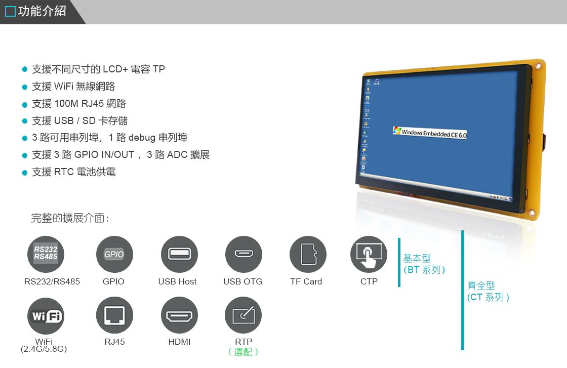 功能簡介: DMA-HMI21以ARM Samsung S5PV210 為主體的智能終端,支援Linux/WinCE 系統為主軸,除了IO等其他介面之外,並整合了有線、無線等通訊的界面,可以讓客戶的產品應用上得心應手(going smoothly and easily)。因此主板功能強大,客戶可依自己的需求功能選擇不同的系列,分為基本型(BT系列),齊全型(CT系列)。 DMA-HMI21 ARM BASE 智能終端一體成型,結合了各種不同尺寸的LCD+電容TP或電阻TP驅動板(4.3/5.0/6.2/7.0/10.1吋)與主板連接共用,在產品功能設計及顯示上做更有彈性的配合。